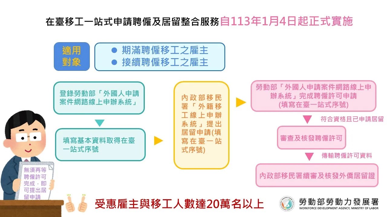勞動部勞動力發展署表示,透過與內政部移民署的跨機關系統整合介接,經由雇主辦理期滿續聘或接續聘僱的在台移工,就可以同時完成聘僱許可及居留或展延居留許可的申請,無須再等到聘僱許可核發後,才能提出居留或展延居留許可申請。